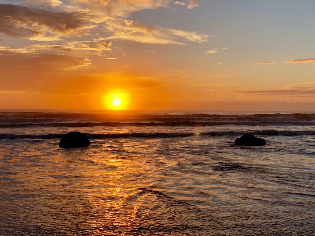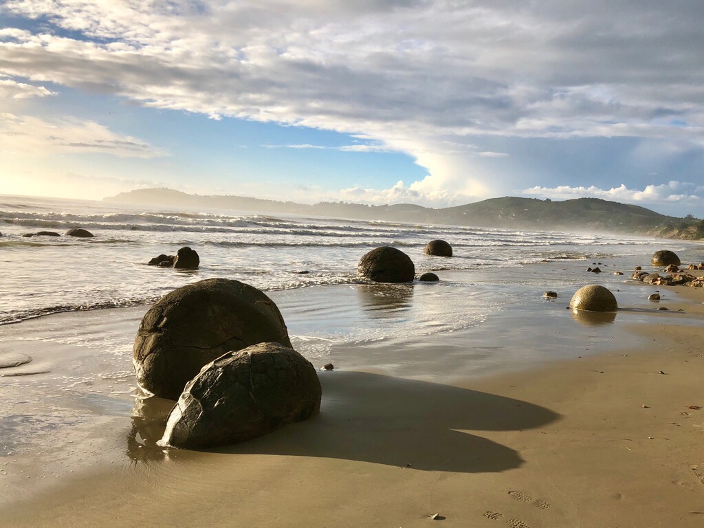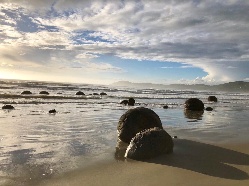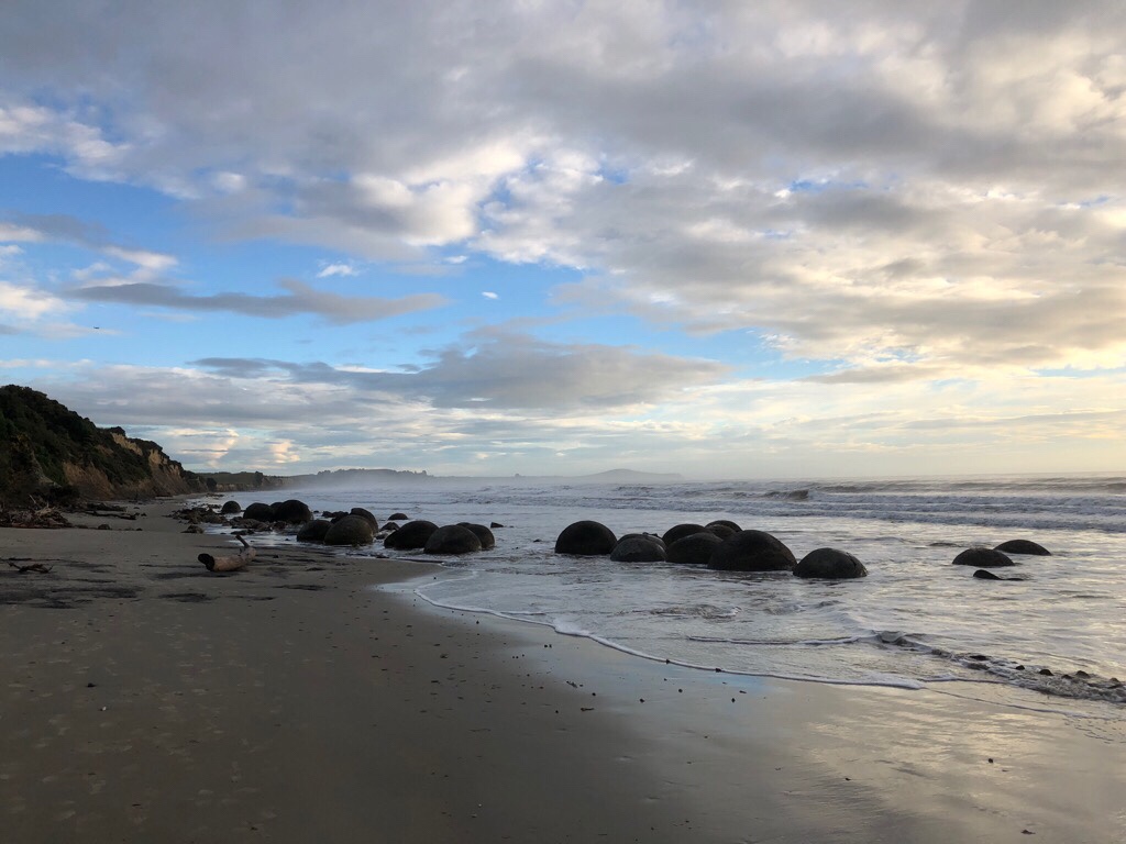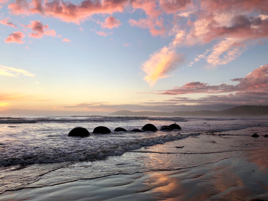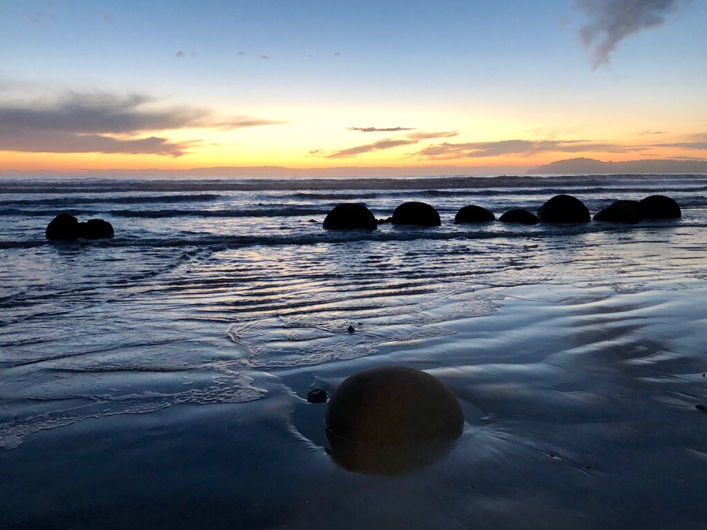Die Moeraki Boulders waren so, wie wir davon geträumt hatten. Ein atemberaubender Morgen meinte es wirklich gut mit uns. Es war ja unser letzter Morgen in Oamarua und wir standen mit grosser Freude um 05.00 Uhr auf. Es regnete nicht wie an den anderen Tagen, wo wir zum Sonnenaufgang an einer „Location“ sein wollten. Das Duschen und damit die „Handtuchfalle“ war an diesem Morgen kein Thema.