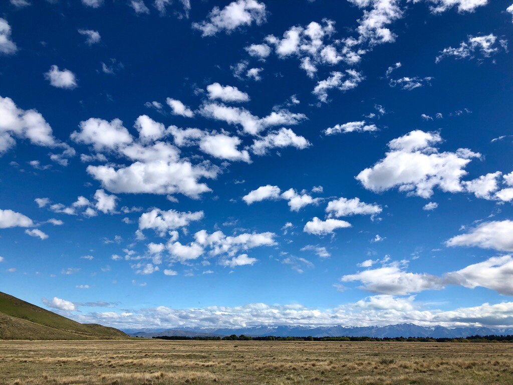 Von hier wären es nur noch 22 km nach Tekapo. Aber wir entschieden uns noch, ein Stück weit der Haldon Road zu folgen. Diese führt durch eine ruhige Hochrbene mit sehr schönen Ausblicken und noch schöneren Wolken.