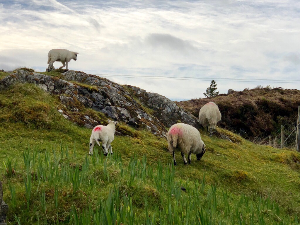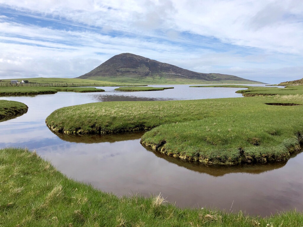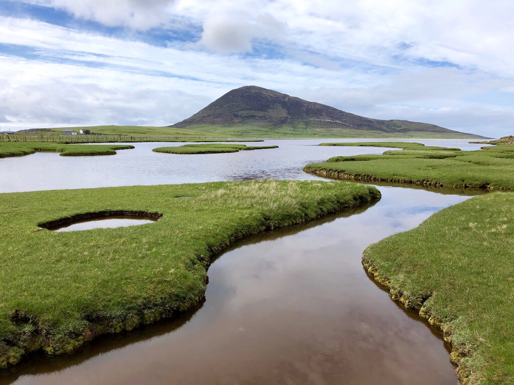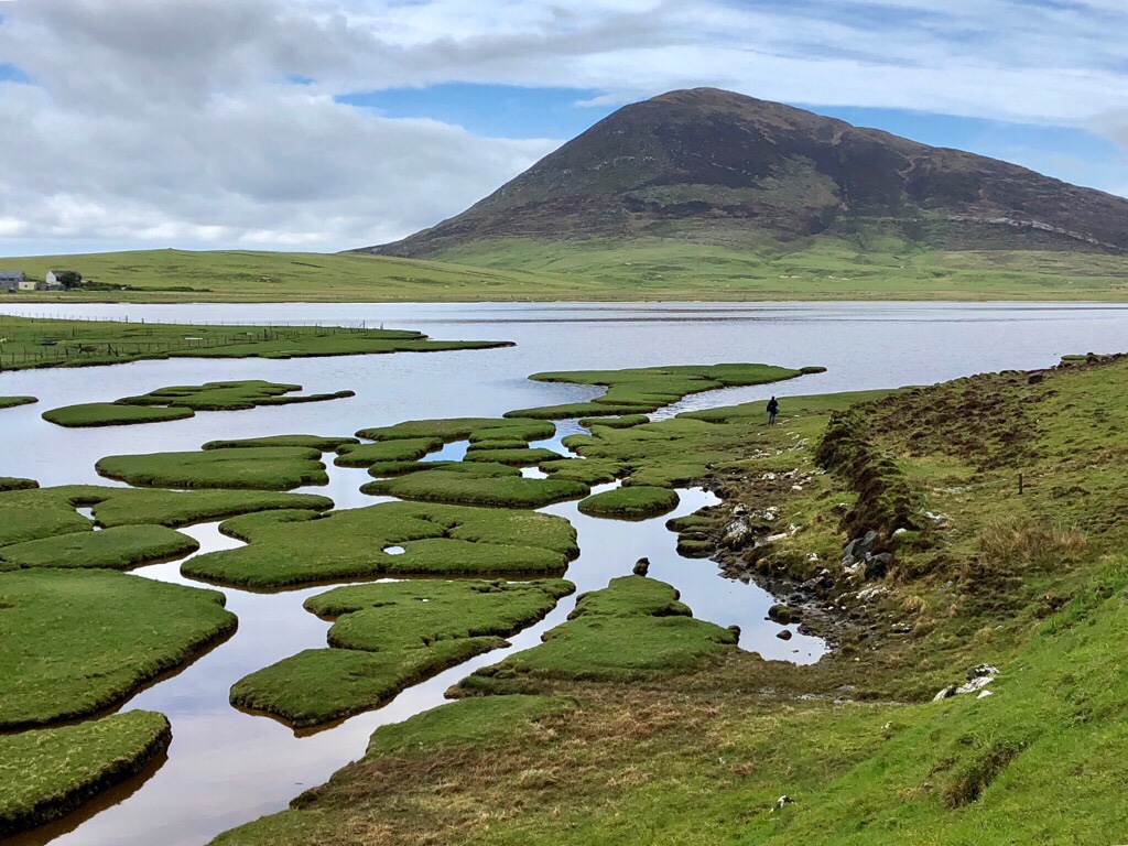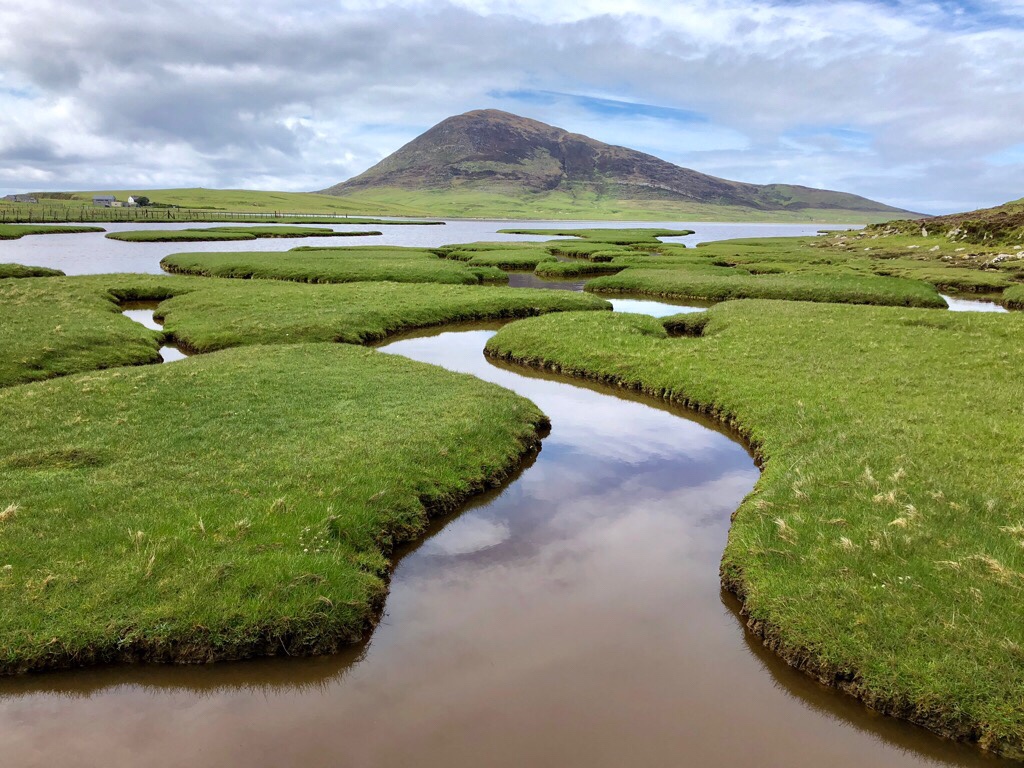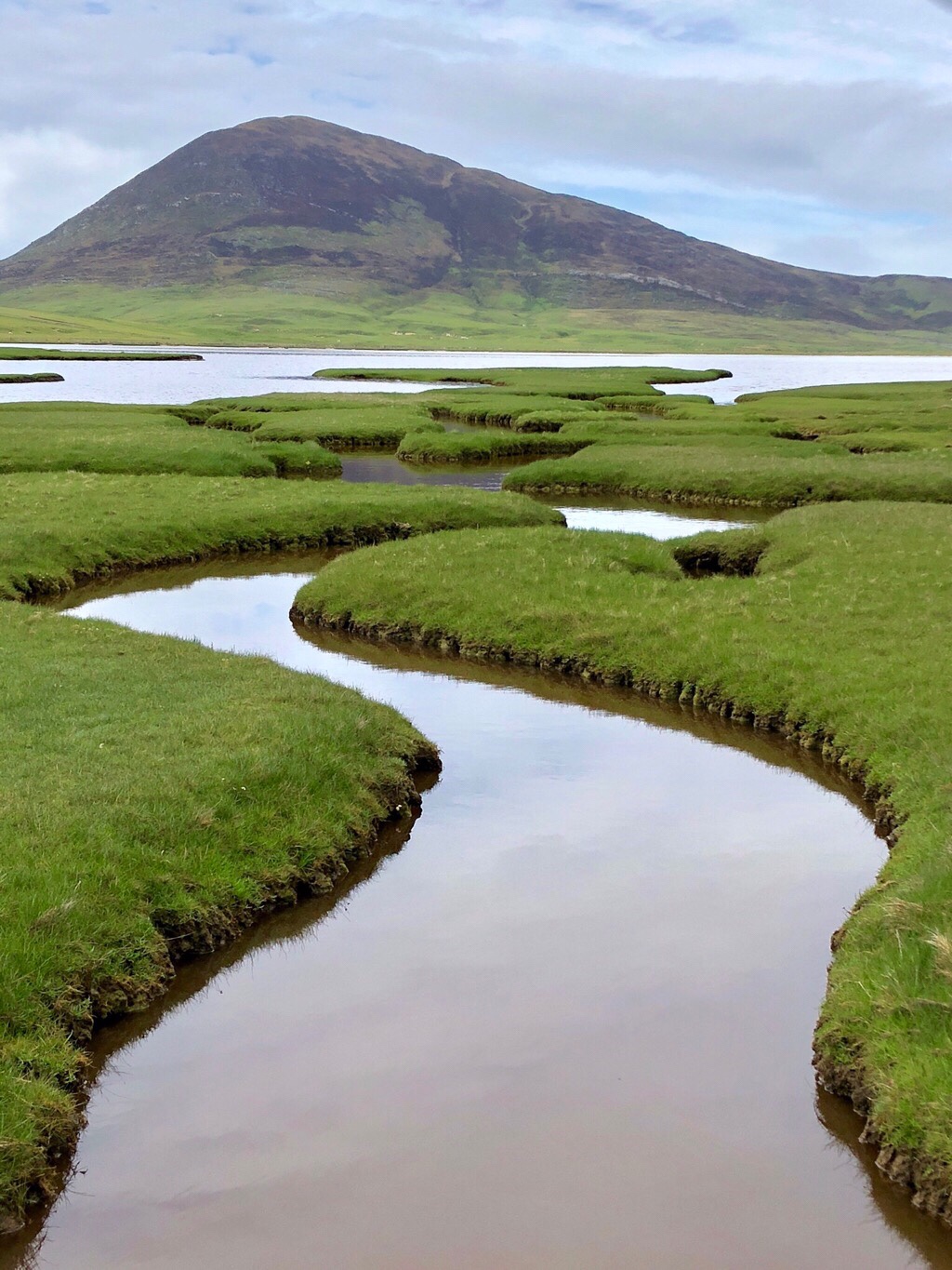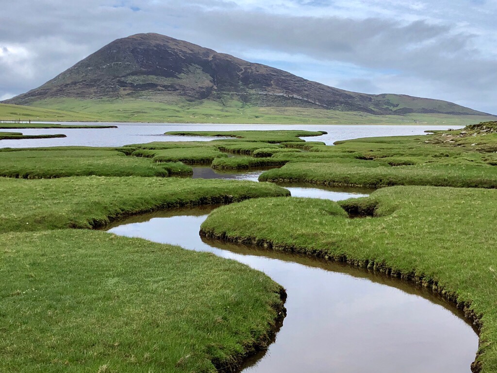 Nach dem Mittagessen regnete es noch immer. Dass ich da meine Regenkleidung anzog, war ja klar, nachdem ich gestern bis auf die Unterwäsche nass wurde. Weniger klar war, dass wenn der Regen aufhört und womöglich Sonne kommt, ein neues Problem auf mich zukommt. Und es kam wie es kommen musste, ich wurde mal wieder nass, diesmal von innen. Wir fuhren zum ersten Fotostopp, einer wunderschönen Wasserlandschaft in Grün, den Salt Marshes Northton, im Hintergrund, der Chaipaval (365 m) über der Scarista beach.