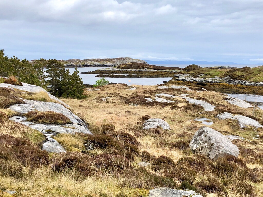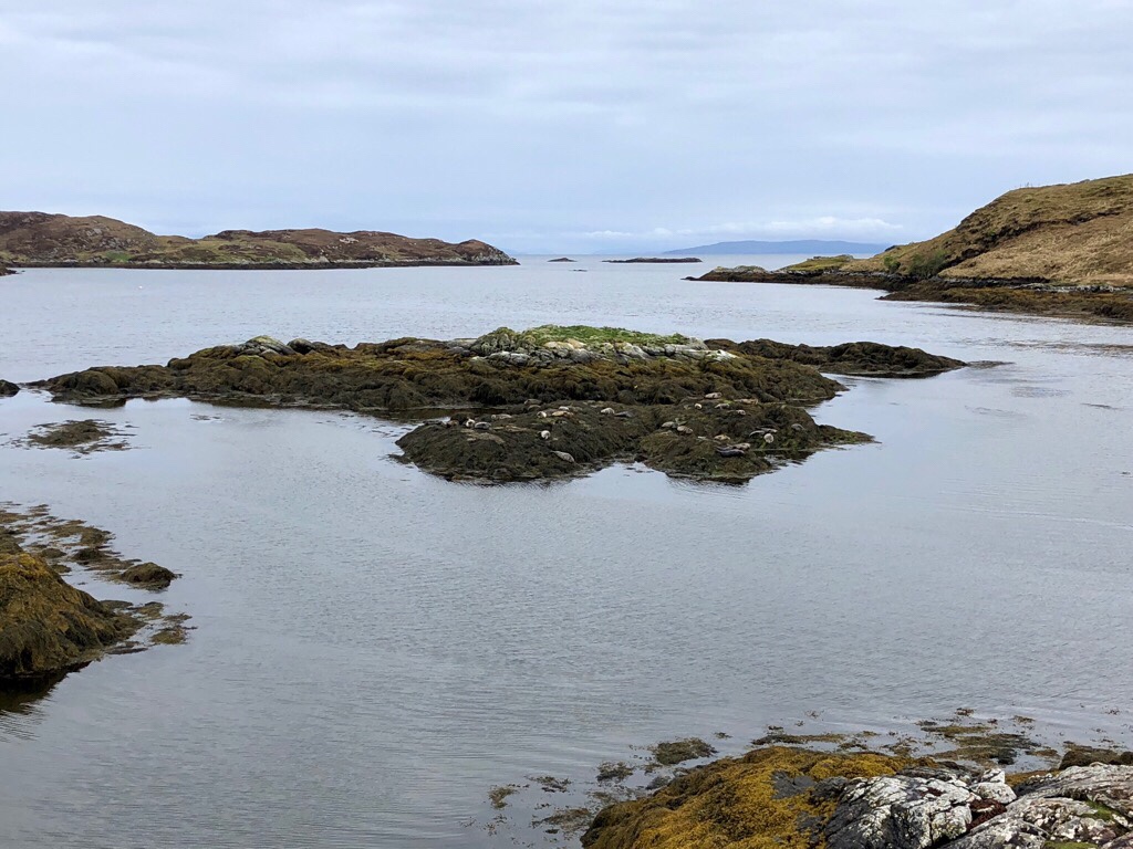 Bei einigen Häusern blieb Marcus stehen. Ein Meeresarm reicht bis fast zur Strasse. Darin ein paar Inseln und auf einer der Inseln, eine „Seal“ Kolonie, Seehunde die faul rumliegen und die Sonnenstrahlen geniessen (Nähe Finnsbay)